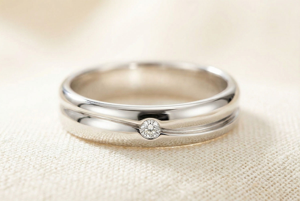 Un inel lat din aur alb este traversat de un val ce îl separă în două părţi. În centrul lui domină un diamant. O verighetă pentru domni şi doamne.