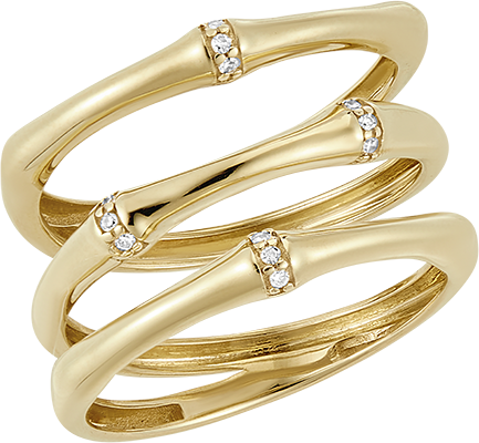 O ramură suplă și totuși solidă de bambus se agață de-a lungul degetului și se transformă într-un inel etern. Nodurile bambusului sunt încrustate cu diamante în aur.