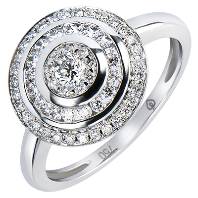 Un inel maiestuos împodobit de un diamant care subliniază un triplu halo încrustat cu diamante. O montură cu caracter şi cu o strălucire fermecătoare.