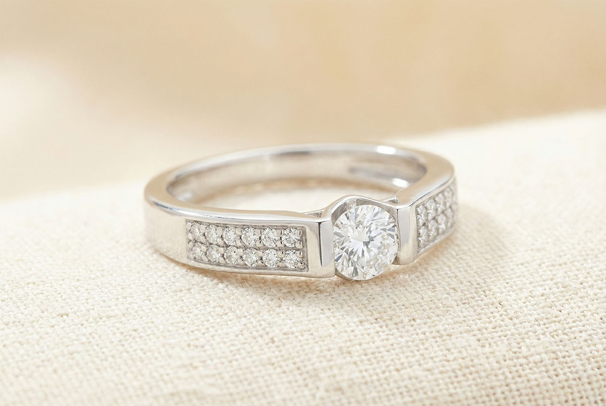 Strălucirea absolută a unui diamant central pe o montură grafică şi contemporană subliniată de un pavaj adiacent de diamante.