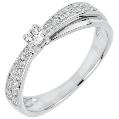 Un diamant solitaire este ţinut de 4 gheruţe pe o montură luxoasă pavată de diamante tăiate briliant. Un inel de logodnă din aur alb şi diamant ce amestecă clasicul şi originalul.