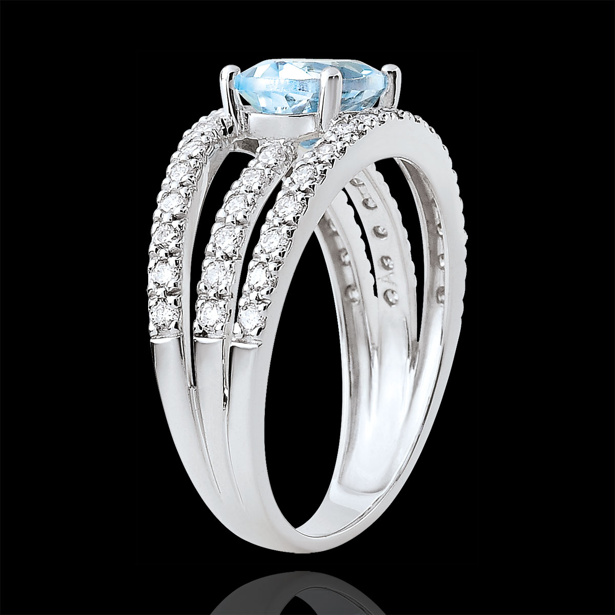 Piatra centrală este un topaz albastru oval de 1,571 carate, cu calitate Very Good.