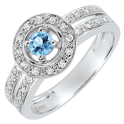Topazul central este pus în valoare de un sipet de briliante. Un inel dublu încrustat cu diamante poartă acest ansamblu şi exaltă în faţa splendorii acestui inel de logodnă din aur alb.