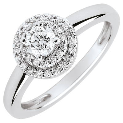 Cu o eleganţă atemporală, acest inel de logodnă scoate în evidenţă un diamant tăiat briliant fixat într-un şir dublu de diamante. Lux şi romantism pentru această centură de diamante.