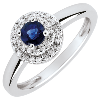 Cu o eleganţă atemporală, acest inel de logodnă scoate în evidenţă un safir fixat într-un şir dublu de diamante. Veneraţie şi romantism pentru această centură de diamante.