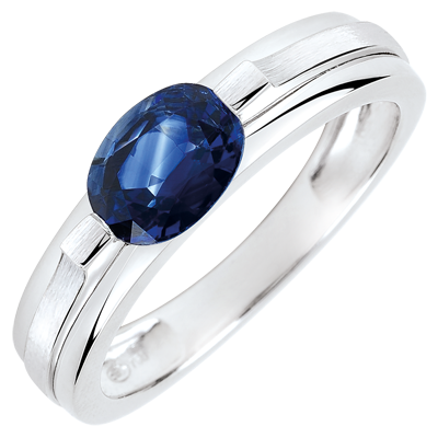 O montură cu eleganţă un minunat safir a cărui frumuseţe pură duce spre sobrietate. Un inel de logodnă din aur alb modern şi simplu.