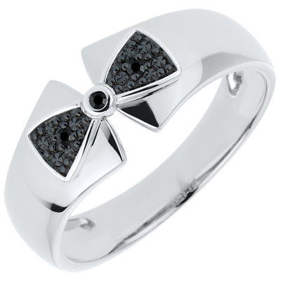 O panglică de aur alb închisă de un nod de aur alb, rodiu negru şi diamante negre pentru a înconjura degetul dumneavoastră.