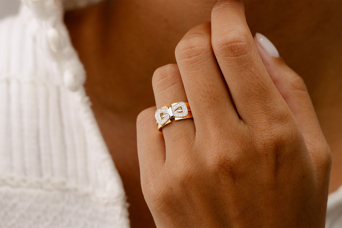 Un corset de aur galben încercuit de aur alb şi unite printr-un nod de aur alb cu diamante.