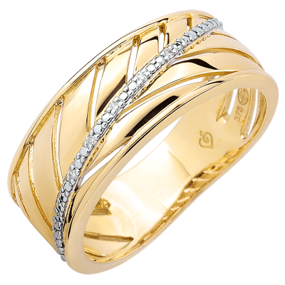 Un inel lat din aur galben inspirat din lejeritatea frunzei de palmier. Tija principală este ornată cu un râu de diamante. Un inel pentru a fi purtat în fiecare zi sau pentru marile ocazii.