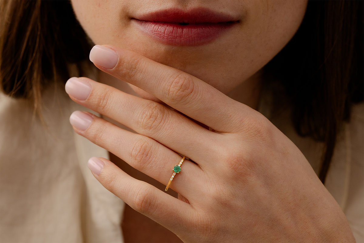 Gloria și esența unui smarald fixat în deplină sobrietate pe un inel din aur galben împodobit cu 6 diamante. O bijuterie clasică și atemporală în același timp pentru o notă de culoare.