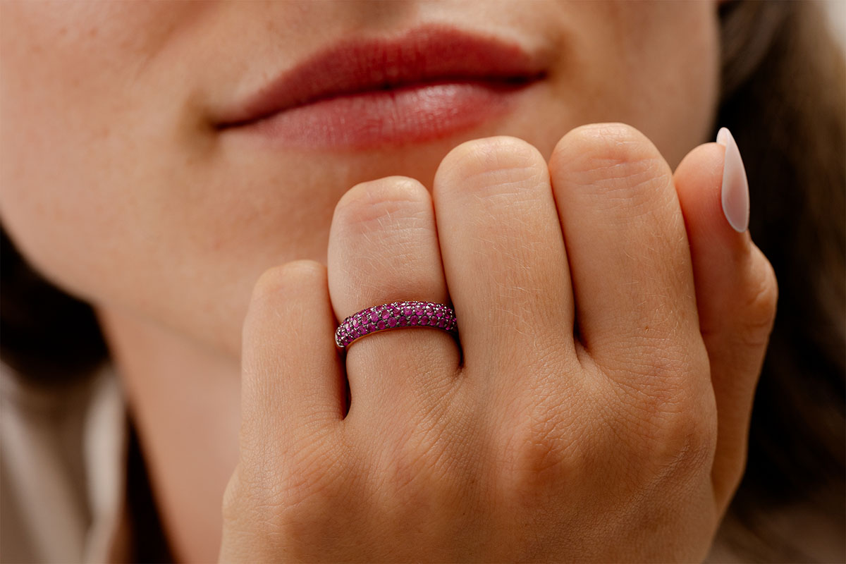 Inel Pasăre din Paradis - trei şiruri - aur roz de 9K şi rubin