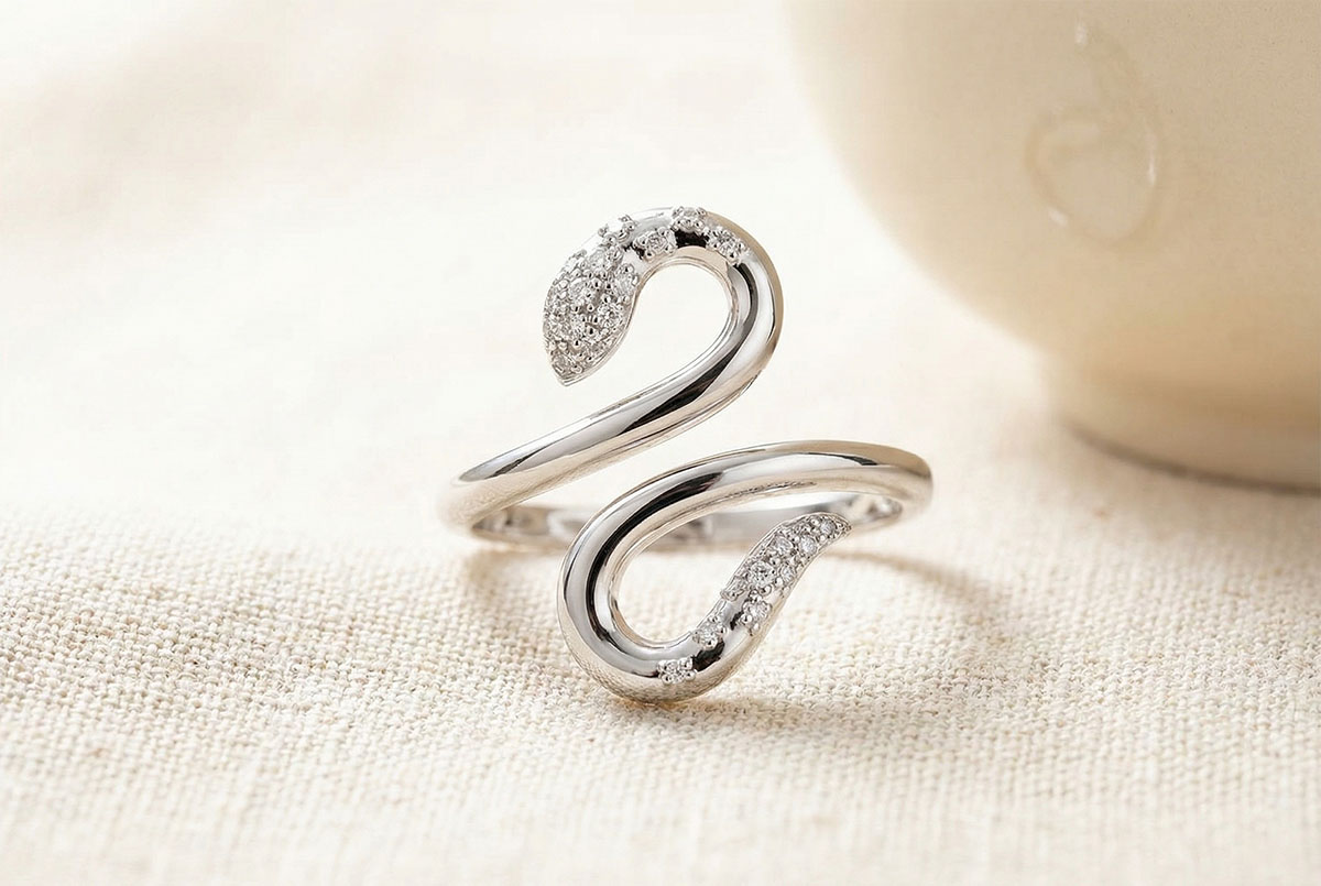 Un inel şarpe sofisticat din aur alb cu forme sinuoase şi ademenitoare ce este finisat cu diamante.