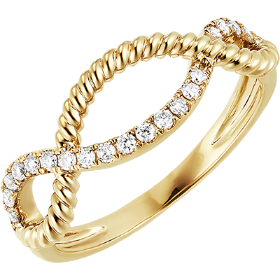 Un inel în care două șnururi de aur se împletesc, aur galben și aur galben pavat cu diamante ca într-o îmbrățișare veșnică.