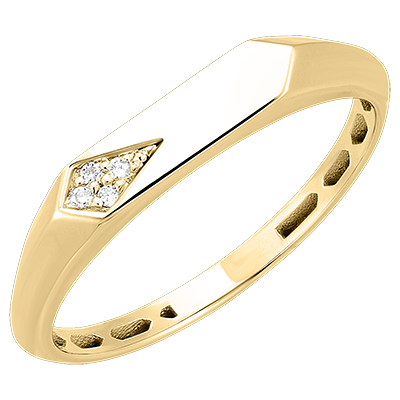 Un inel elegant din aur galben, caracterizat prin linii rafinate și un model geometric încrustat cu diamante strălucitoare care captează lumina din orice unghi. O bijuterie clasică și în același timp foarte modernă.