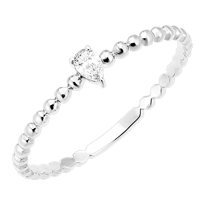 Inelul Solitaire Bule Pară conține un diamant delicat tăiat pară, așezat pe un inel de aur alb presărat cu bule pentru o notă de grație modernă.