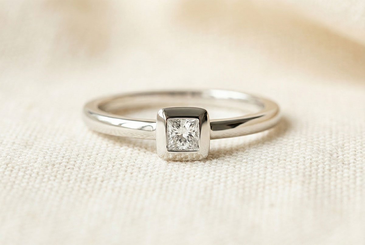Un inel solitaire regândit, încrustat bezel sub formă de pătrat. Poate fi purtat singur sau asociat celorlalte forme ale colectiei.