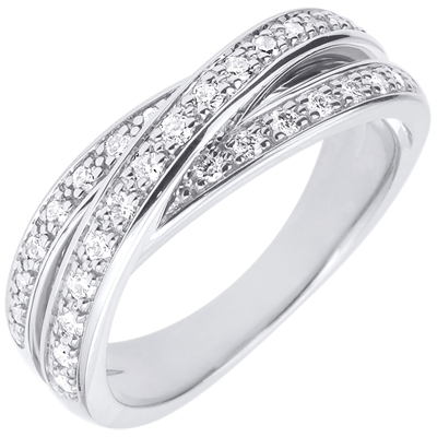 Amestecul echilibrat a trei inele subliniate de luxoase pavaje de diamante. Acest inel de aur alb şi diamant este o bijuterie ce poate deveni verighetă sau cadou excepţional.