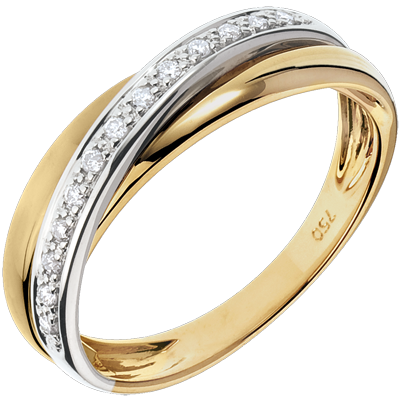 O uniune echilibrată în două nuanţe de aur, subliniată de un pavaj de diamante încrustate în aurul alb.