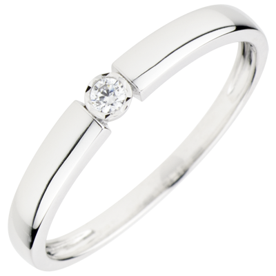 Un diamant înconjurat de o panglică din aur alb devenind un solitaire modern şi oferind un confort optim.