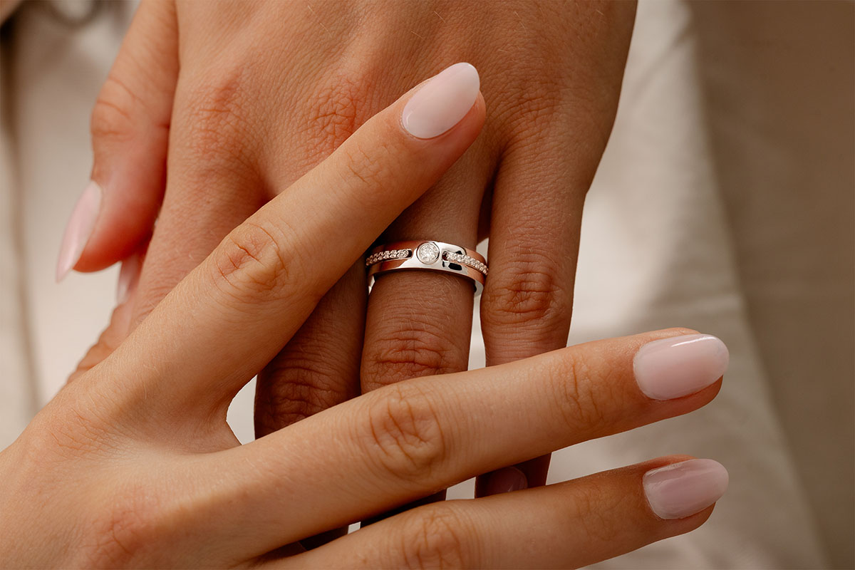 Două linii de diamante pe un inel de aur alb sunt unite în jurul unui solitaire ca într-o promisiune pentru eternitate.