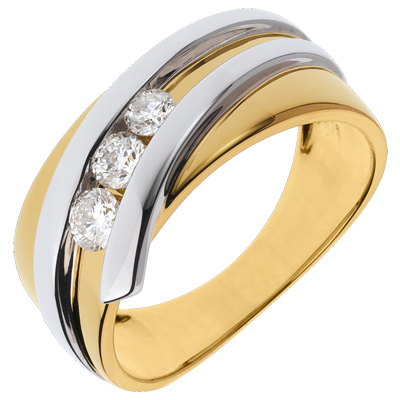 Sobrieatea unui inel din aur galben înconjurat de o panglică de aur alb unde este încrustată o trilogie de diamante.
