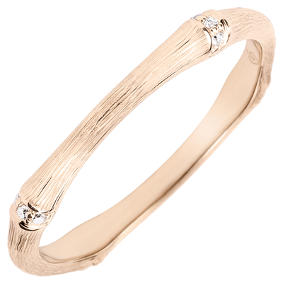O tulpină de bambus suplă şi totuşi solidă se metamorfozează într-un inel etern din aur roz cu lustru periat, încrustat cu diamante. Finisarea mată realizată manual îi oferă un aspect natural de un realism surprinzător.