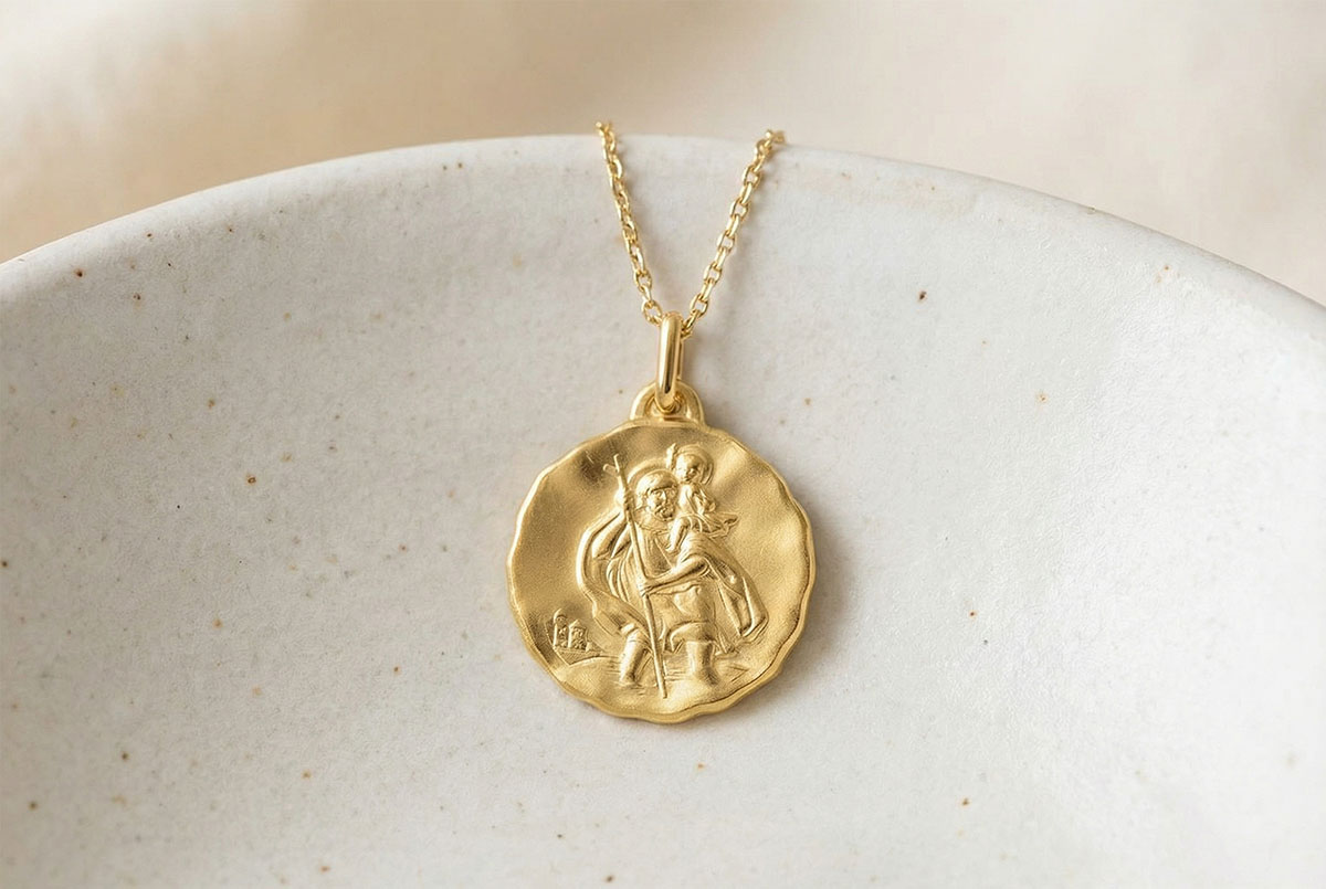 Această medalie din aur galben reprezintă pe Sfântul Cristofor purtând Pruncul Iisus prin ape. Relieful detaliat al scenei exprimă cu putere devotamentul și protecția Sfântului Cristofor, evidențiind în același timp figura senină a lui Iisus. Designul rotund, cu margine ușor ondulată, îi conferă un caracter unic și atemporal. Ideală pentru a însoți o călătorie spirituală, această medalie de protecție este perfectă pentru un botez, o cununie sau orice altă ocazie specială.