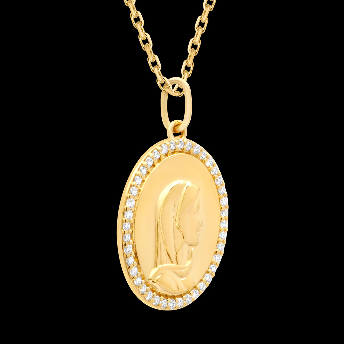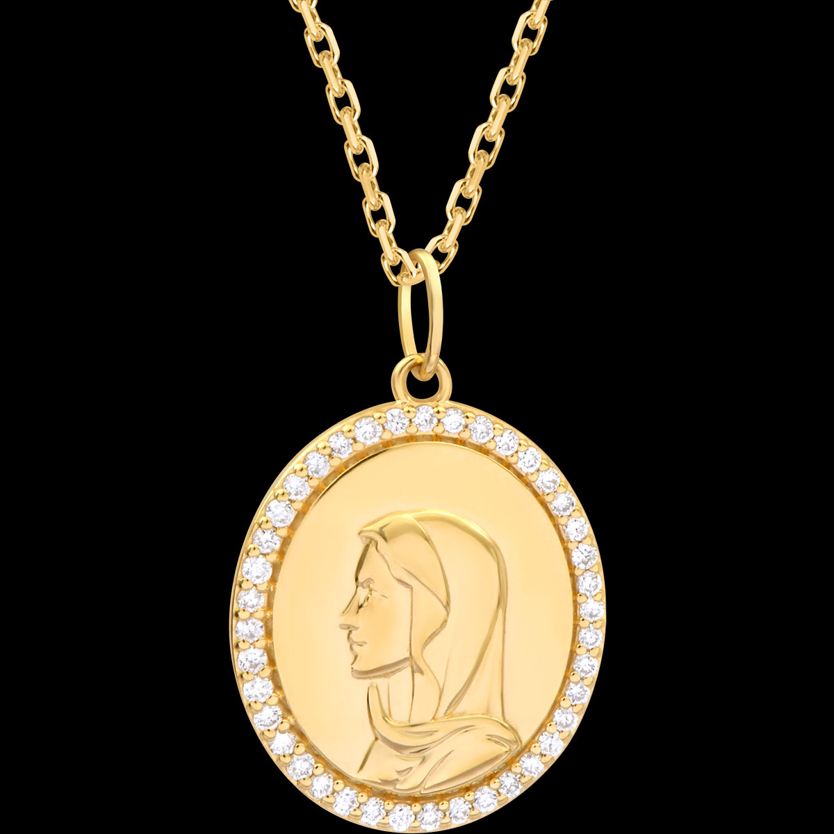 Acest medalion din aur galben de 9 karate o reprezintă pe Fecioara Maria fin gravată din profil, înconjurată de un montaj delicat cu diamante de laborator ce îi amplifică strălucirea și rafinamentul.Dimensiuni: 15x17mm – 22,5mm înălțime cu anouFinisaj: Aur galben lustruitLivrat într-o cutie elegantă, ideală pentru a fi oferită