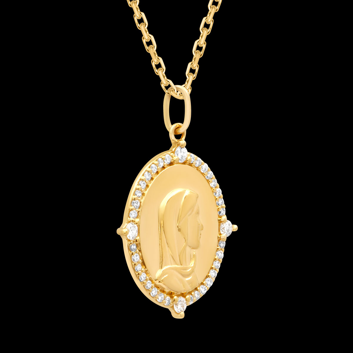 Acest medalion oval din aur galben de 9K o reprezintă pe Fecioara Maria, fin sculptată în relief, încadrată de diamante sintetice și detalii laterale ce îi accentuează strălucirea și eleganța.Dimensiuni: 17 x 19 mm – 25 mm înălțime cu anouFinisaj: Aur galben lustruitLivrat într-o cutie rafinată, perfect pentru cadou