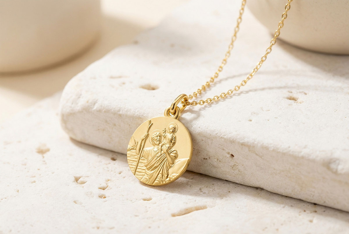 Acest medalion din aur galben îl înfățișează pe Sfântul Cristofor purtând Pruncul Iisus pe umeri, un gest emblematic de protecție și bunăvoință divină. Sfântul Cristofor, simbol al puterii și al călăuzirii, traversează un râu, purtându-l pe Iisus în siguranță. Acest motiv plin de semnificație este ideal pentru cei care doresc să se simtă protejați pe parcursul călătoriei lor. Un medalion perfect pentru un botez sau pentru a însoți pe cineva în căutarea protecției divine în viața cotidiană.