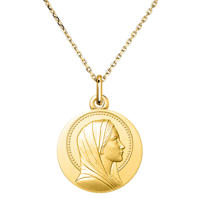 Acest medalion din aur galben prezintă un profil elegant al Fecioarei Maria, emanând serenitate. Chipul său blând, încadrat de o aură subtil detaliată, evocă puritate și protecție divină. Cu designul său rafinat, acest medalion este un simbol al credinței discrete și al binevoinței materne. Ideal pentru un botez, o comuniune sau o altă ocazie spirituală, oferă o frumoasă amintire a prezenței protectoare a Fecioarei.