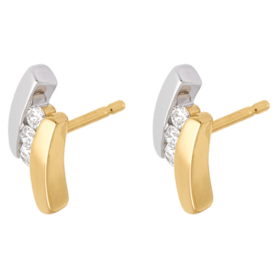 O trilogie între ghilimele din aur galben- aur alb, într-o pereche de cercei cu şurub delicaţi şi spontani.