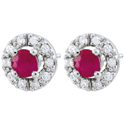 Un cerc de aur alb încrustat cu diamante, protejează ca într-un cuib un rubin.