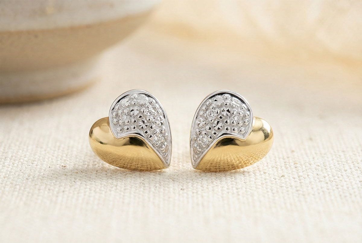 O pereche de cercei cu şurub, bicolori, două valuri de aur alb şi diamante peste inimi din aur galben.