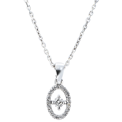 Conturul pavat al unui medalion ornat cu un diamant fixat cu gheruţe într-un pandantiv clasic şi atemporal. O strălucire blândă şi delicată la baza gâtului.
