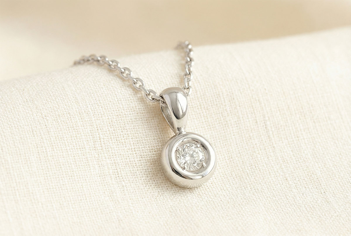 Un diamant ţintuit în inima unui caliciu din aur alb, într-un pandantiv rotund.