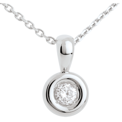 Un diamant ţintuit în inima unui caliciu din aur alb, oferind rotunjime unui pandantiv.