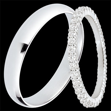 Un set elegant de verighete pentru ea & el. Un inel complet împodobit cu 38 de diamante de 0,57 carate pentru ea și o verighetă din aur alb, polisată, de 4 mm pentru el. Rafinament și strălucire pentru o iubire eternă.