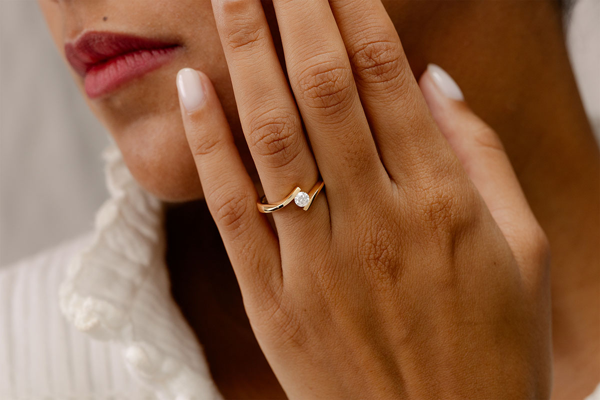 O montură ce pare a fi în mişcare şi care dezvăluie strălucirea unui diamant central.