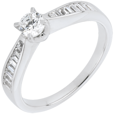 Un solitaire pur însoţit de diamante tăiate baghetă încrustate într-un inel din aur alb.