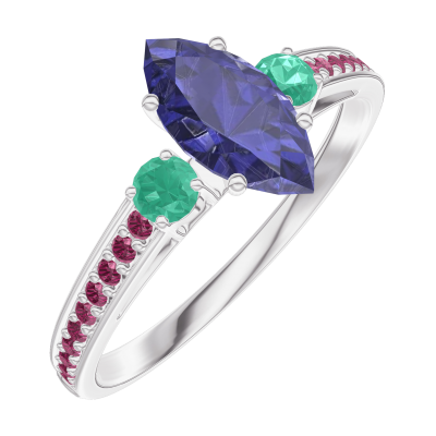 « L'ATELIER » NR. 164191Inel Aur alb 18 carate - Safir albastru Marquise 0.5 carate - Pietre laterale Smarald - Încrustare Rubin