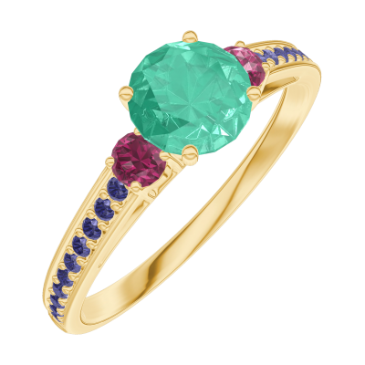 « L'ATELIER » Nº164253Inel Aur galben 18 carate - Smarald rotund 0.5 carate - Pietre laterale Rubin - Încrustare Safir albastru 4.5