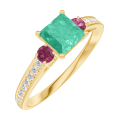 Inel Aur galben 9 carate - Smarald Princess 0.5 carate - Pietre laterale Rubin - Încrustare Diamant