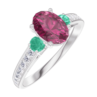 « L'ATELIER » Nº165788Inel Aur alb 9 carate - Rubin Oval 0.7 carate - Pietre laterale Smarald - Încrustare Diamant