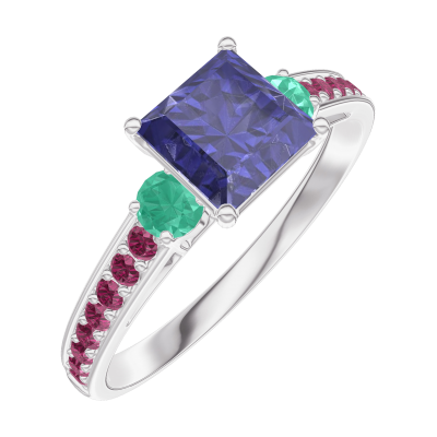 « L'ATELIER » NR. 166192Inel Aur alb 9 carate - Safir albastru Princess 0.7 carate - Pietre laterale Smarald - Încrustare Rubin