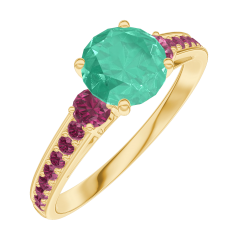 Inel Aur galben 18 carate - Smarald rotund 0.7 carate - Pietre laterale Rubin - Încrustare Rubin