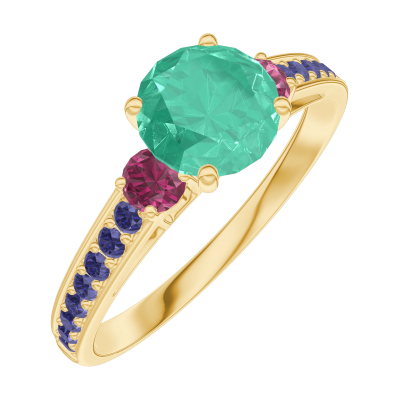 « L'ATELIER » Nº166653Inel Aur galben 18 carate - Smarald rotund 0.7 carate - Pietre laterale Rubin - Încrustare Safir albastru 5