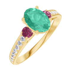Inel Aur galben 9 carate - Smarald Oval 0.7 carate - Pietre laterale Rubin - Încrustare Diamant