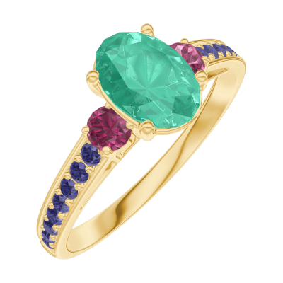 « L'ATELIER » Nº166954Inel Aur galben 9 carate - Smarald Oval 0.7 carate - Pietre laterale Rubin - Încrustare Safir albastru