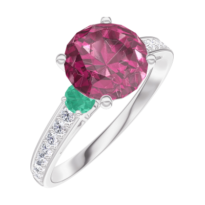 « L'ATELIER » Nº167888Inel Aur alb 9 carate - Rubin rotund 1 carate - Pietre laterale Smarald - Încrustare Diamant  4.7